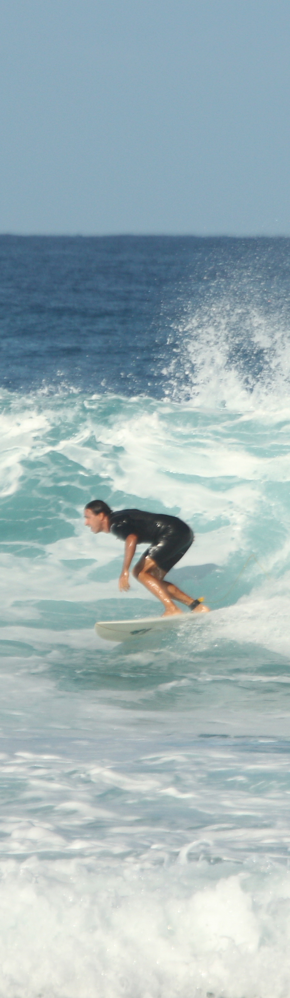 Example full height image of surfer in Hawaii made with Canon 70-200 f/4 L IS + Canon 2x III extender on a Canon 1D Mark IV camera, 1/1250 second at f/9. Image slice is right of center. Notice the flair on the specular highlights. There is no sharp plane of focus. The specular highlights are pinpoints (showing no movement problems) with flair coming off in multiple directions. The 70-200 f/4 L IS + 2x is not a great combination. Better to get a longer focal length lens if you need the reach. In a less extreme environment, this might do in a pinch and might be sharpened (with deconvolution, not unsharp mask) but I do not recomment it.