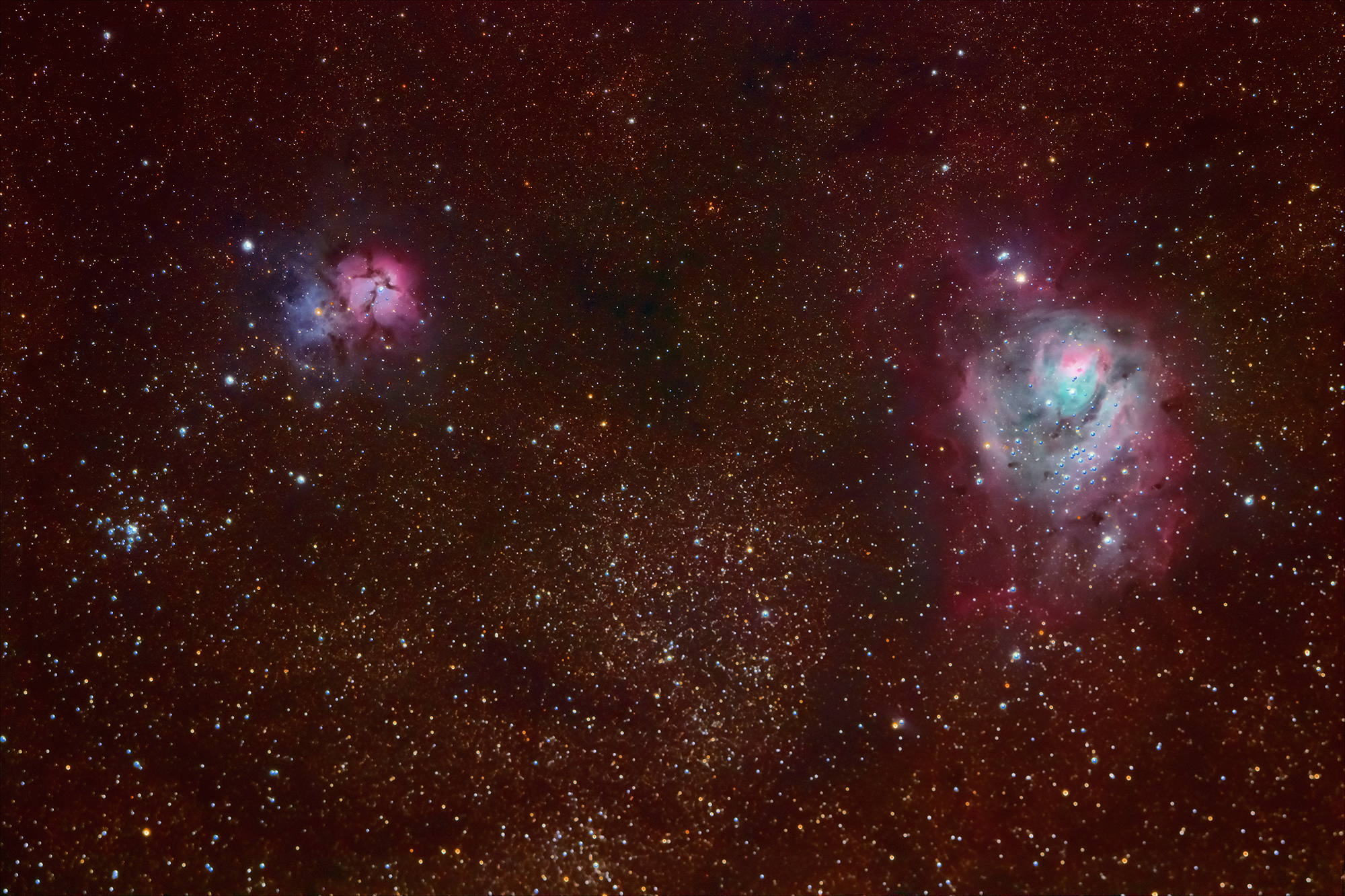 Blue in M8 and core of M20 is oxugen + hydrogen emission.